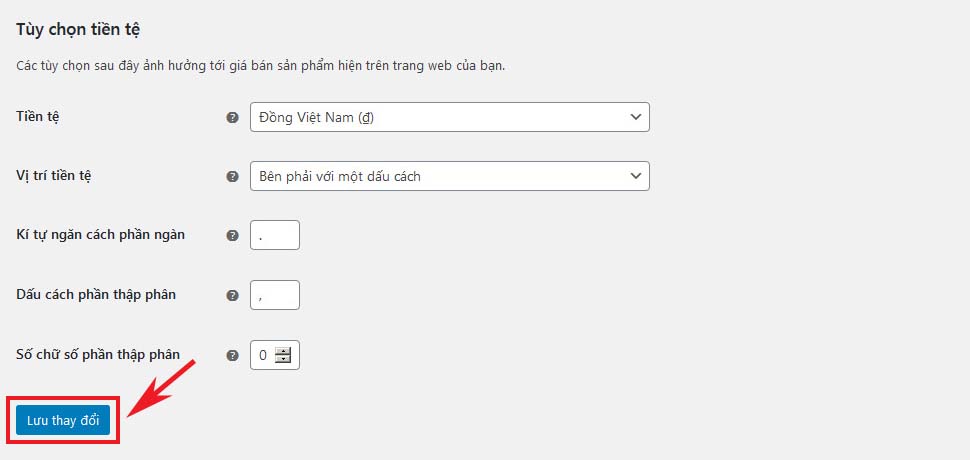 Phần tiếp theo trong Cài đặt chung là Tùy chọn tiền tệ. Bạn có thể đặt đơn vị tiền tệ ưa thích mà bạn muốn thực hiện các giao dịch của mình. WooCommerce chỉ cho phép chọn một loại tiền tệ tại một thời điểm. Lựa chọn mà bạn thực hiện ở đây sẽ xác định đơn vị tiền tệ nào được hiển thị trong danh mục sản phẩm ở giao diện người dùng của trang web. Điều này cũng quyết định loại tiền tệ mà các cổng thanh toán chọn cho các giao dịch của bạn.